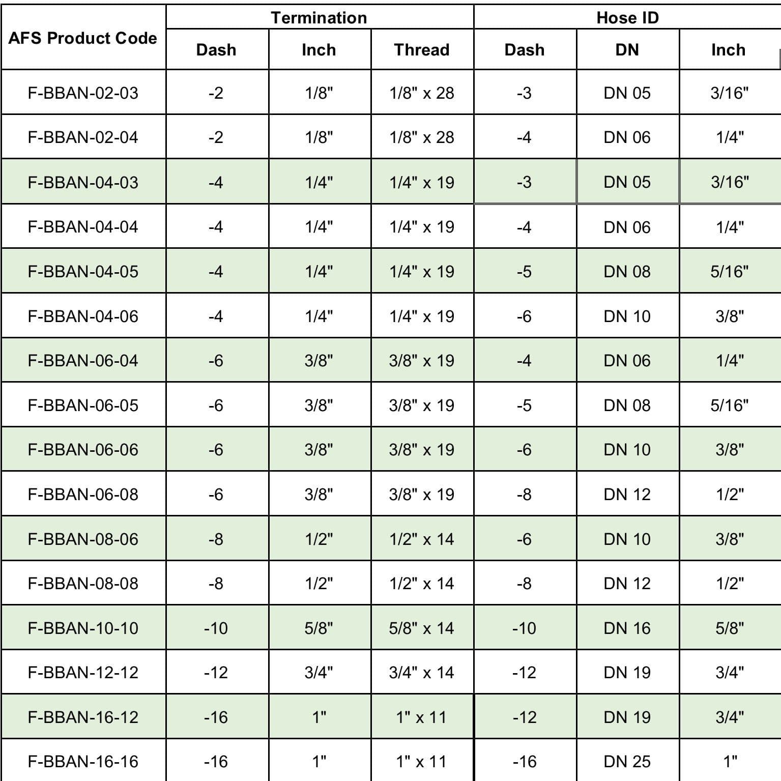 | F-BBAN-06-08 | -6 | 3/8" | 3/8" x 19 | -8 | DN 12 | 1/2" |